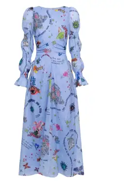 The Caracus Cut Out Gown in The Magician, a Kate Ford exclusive hand-drawn print from our Pre Fall 2023 Collection, Lost in Translation.A light weight Ramie dress, featuring flattering side ruched cut out detailing, round neckline with invisible zipper down centre back and puff sleeves with shirred panels and flare skirt.- Kate Ford exclusive print- Light weight ramie fabric- Ruched cut out detailing- Puff sleeves with shirred panels- Flare cuff- Flattering neckline- Flare hem- Invisible zipper- Cotton voile lining