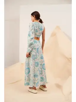 The Nemea Opened Gown in Nyx, a Kate Ford exclusive hand-chosen print from our Spring Summer 2023 Collection, Divine Domain. A light weight Linen dress featuring a singular blouson cuffed sleeve and cut-out detailing. - Kate Ford exclusive print