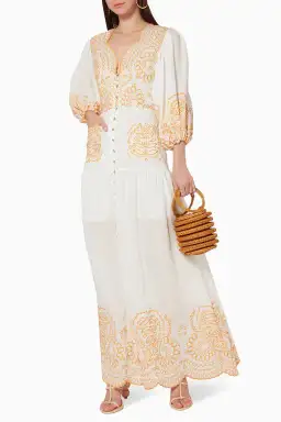 A stunning piece that is perfect for any special occasion. This dress features our beautiful print on an airy cotton and comes with full length gold closure. The shoulder and sleeve panel with tuck detail adds a touch of elegance, while the maxi length gives you an elegant presence. Pair this dress with your favourite heels and clutch for a look that is sure to turn heads.