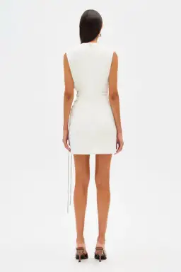 The Kendy Bonded Crepe Mini Dress in Ivory, a refined take on the classic party-dress.