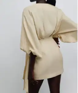 Crafted from a relaxed linen blend fabrication, this style features accentuated sleeves, plunging neckline, wrap front closure and adjustable tie at the waist.