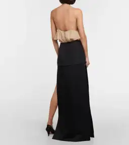 A sleek, floor-length skirt in bonded crepe satin. With layered effect, deep side slits, and concealed side zipper closure.
