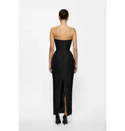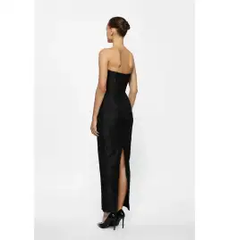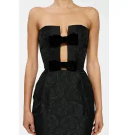 The Kiera Dress by Effie Kats exudes sophisticated elegance with its strapless brocade design and deep plunging neckline. Featuring two distinctive bows at the bodice, this structured gown combines playful details with luxurious texture, making it perfect for black-tie events and memorable celebrations.