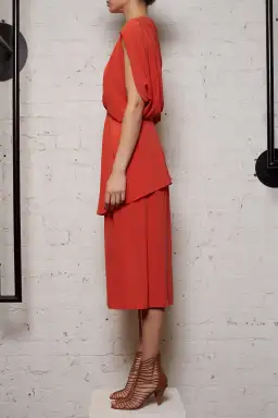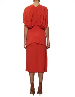Features concealed centre zip at the back, beautiful silk dress sure to turn heads - perfect for the festive season and/or any celebration! The melon colour is in between a coral orange/red. Sleeves are a cape style - a classic KITX aesthetic.
