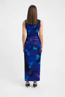 Elevate your evening wardrobe through the combination of cool blue hues and the abstract pattern of the Dusk Midi Dress. Made from lightweight mesh, the elongating midi style exudes a sleek and figure-skimming silhouette. The slashed neckline design features rouching at the midline for a flattering look and comfortable feel.Balance the dark tones featured throughout the dress with a simple black heel.