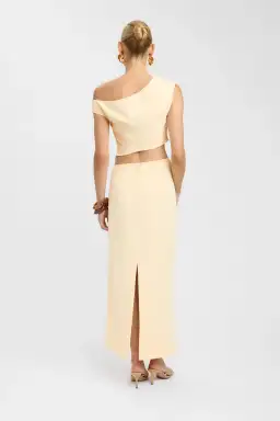 The Opal Maxi skirt is a timeless piece that exudes effortless elegance features a soft yellow hue and a flattering ruched side seam, the back vent adds ease of movement, making it perfect for any occasion.