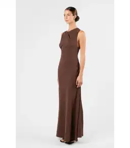 Timeless in design, the Kota Maxi in Moccona features a draped décolletage detailing that gracefully sculpts the bust and defines the fitted silhouette. The partially exposed back is adorned with a sculptural panel on the right-hand side, adding a touch of unique allure and sophistication. Perfect for special occasions, the Kota exudes effortless style and refinement.