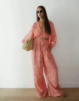 This is a vibrant and relaxed two-piece set featuring a bold coral and white abstract leopard print. The outfit includes a cropped wrap-style top with a plunging neckline, voluminous balloon sleeves, and an elasticated hem for a comfortable fit. The matching high-waisted wide-leg pants have a flowy silhouette with an elastic waistband and side pockets, offering ease and movement. Styled with a statement lime-green wide-brim hat and neutral pointed-toe heels, this set is perfect for making a chic yet effortless statement at resort getaways, brunches, or summer events.