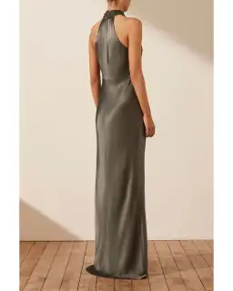 High neck twist maxi dress in a silk touch fabric with a luxurious sheen.