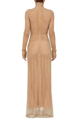Lattice mesh long sleeve gown with gold studded details, invisible zipper closure and semi-sheer lining.