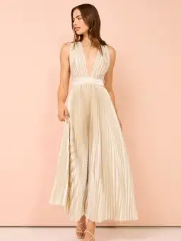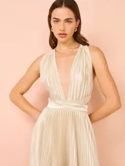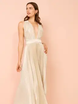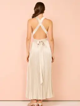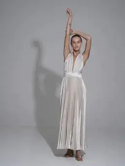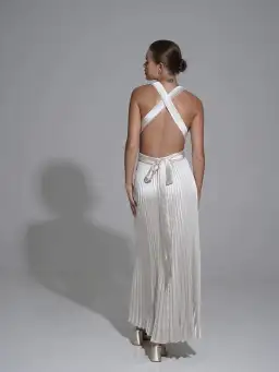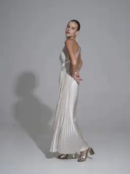 A contemporary silhouette that favours luxurious details. Featuring a plunging neckline and exquisite cross over back that wraps around waistline. This gown is sure to lend you an air of opulence.