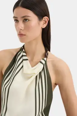 The Leilana Mini Dress is crafted from lightweight silk crepe de chine in the SIR. exclusive Garden Stripe print. Designed for a soft drape through the body, it features an open back, removable waist tie and a high cowl neckline adorned with a cluster of beads.
