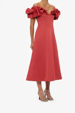 Leo Lin Annie Off Shoulder Frill Midi Dress Red
