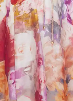 Be enchanted by the Fleur Print, a joyful explosion of blooms in deep magenta, soft blush, lavender purples, and autumnal ochres.