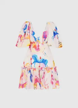 This carousel print transports you directly back into the memories of childhood, as stationary carousel horses are brought to life in a muted palette. Whirling and vibrant, the print touches upon the joy of youth in all its shining glory.