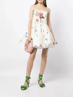 Premium silk cotton mini dress, Embroidered placement print, Straight strapless neckline, Invisible back zip closure, Voluminous skirt, Structured crinoline hem