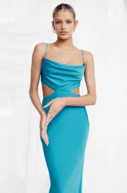 The Celia Dress features a flattering cowl neckline that is fastened at the back with a hook and eye closure. It has a sexy cut-out design at the waist and a full length hemline that eventuates into a puddle train.