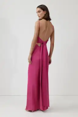 The Venus dress is cut from a luxe, heavyweight recycled satin. It features delicate gathers at the waist and and a slight mermaid skirt. The straight neckline with simple spaghetti straps eventuate into a scooped back design with a free flowing sash that can be tied into a knot or bow at the waist.