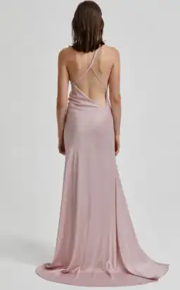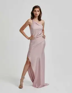 Cut on the bias for the ultimate figure flattering fit. It features a twisted, one shoulder neckline that plunges into a low back and free-flowing skirt. Sandwashed Satin Fabric Bias Cut Twisted Tulle Neckline Detail