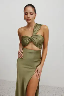 The josefina dress it cut from a heavyweight satin, which features an elegant wrap bodice design with a one shoulder detail. The exposed midriff accentuates the waist and closes up at the side,creating a fully enclosed back. The soft ankle length skirt showcases our signature thigh high split.