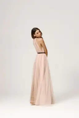 The Kenzie dress features a light tulle overlay in the perfect shade of pale pink, it is ruched at the waist and neck for a softly gathered effect and lined with a nude power mesh for the ultimate sheer effect. The waistline and neck are accented with a gold metallic coated trim.