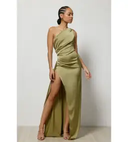 The Samira is a glamorous and sexy floor length gown made from stretch satin which catches the light perfectly on its strategically placed folds. The one shoulder neckline is demure at the front then continues on to a low back, kept in place with the diagonal strap. We have incorporated our signature thigh high split with a slight puddle train at the back. A simply timeless and glamorous gown.