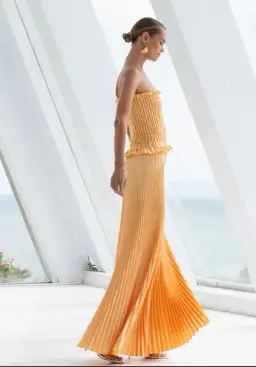 The Maya Gown is a stunning strapless dress featuring an elasticated ruched bodice that effortlessly flatters the figure. Its elegant design flows into a floor-length skirt adorned with graceful umbrella pleats, creating a sophisticated yet modern silhouette. Perfect for formal events or special occasions, this gown offers both comfort and timeless style.