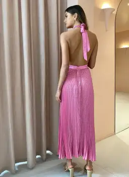 Featuring a pleated halter upper with statement neckline which softens into a dramatic umbrella pleat skirt, falling from the waist to the ankles, the Renaissance Dress is dramatically feminine, making it the perfect go-to for your special occasion.