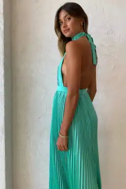 This dress boasts a chic and stylish look made from the iconic L'Idee pleated fabric. Ideal for formal events, it features a halter style neckline with a self-tie bow and ribbed pleating on the torso.