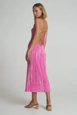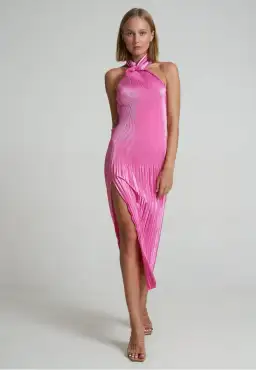 Soiree Pleated Halter Dress which features a flattering halter neckline, with a high stretch midi and pleating design to compliment anyone!