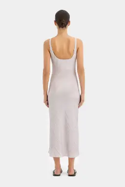 The Ligera Bias Slip Dress in silver is a modern design crafted from a lightweight satin fabric with a crinkle cut texture and shiny finish. Offering a bias cut designed to skim the body, with a scooped neckline that can be worn reversible, making it a versatile style.