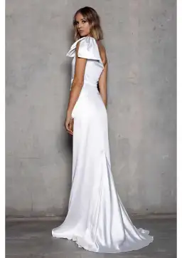 One shoulder gown features gorgeous shoulder bow and side split flowy skirt
