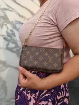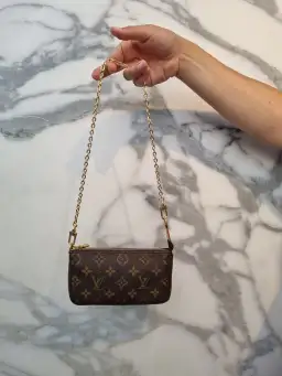 A true BABY Louis Vuitton! This darling Bucket Pochette features the classic Louis Vuitton monogram in gorgeous brown leather and canvas. Small yet spacious for all your essentials, this bag needs no introduction and will be instantly recognisable at your next event. Comes with both a chain shoulder strap and a shorter leather strap if you want more of a top-handle look.