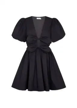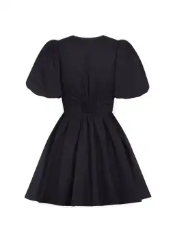 This mini dress is black, made from butter-soft cotton poplin, featuring double bow front details, blousy puff sleeves and a flattering deep V-front neckline.