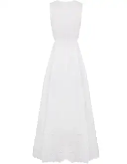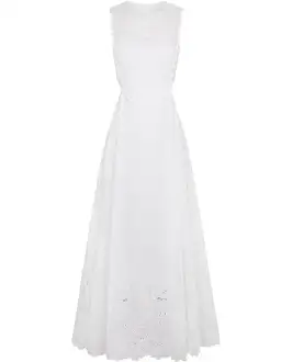 Made from premium 100% linen, featuring a delicate cutwork embroidery bodice panel, cut-out side details and a sweeping full embroidered skirt.