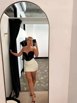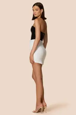 Amazing mini dress with plunging neckline, structured inner bodice and draped mini skirt. Featuring boning throughout the bodice for a snatched look. Flattering deep tucks at side waist. Invisible zip at back, fully lined.