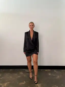 Luxe plunging blazer dress with oversized feel. Featuring a soft collar, deep tucks at button closure and barely there shoulder pads. Crafted in a lightweight satin, this blazer dress feels super luxurious. Fully lined.