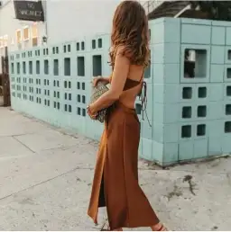 The Imani Dress is unlined, has an adjustable back tie and hidden zipper closure, front seam slit and satin fabric with front knot.