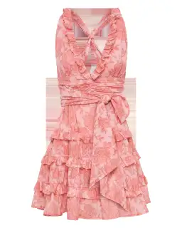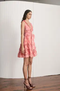 The Lucien Layered Sleeveless Dress in Eden, a Kate Ford exclusive hand-drawn print from our Fall 2023 Collection, Spirare. A lightweight cotton dress featuring a flattering v neckline with ruffle detailing and flattering bust gathering detail with a layered mini skirt