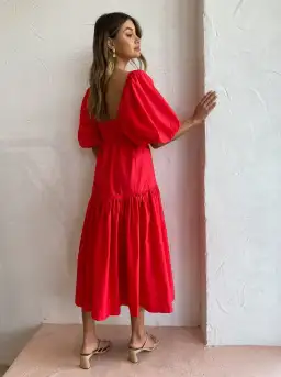Feel endlessly romantic in the Luna Dress in Scarlet by Steele.Crafted from a crisp cotton poplin fabrication, this midi dress features exaggerated puff sleeves and a ruched sweetheart bodice with a dramatic drop waist that falls into a flattering gathered skirt.