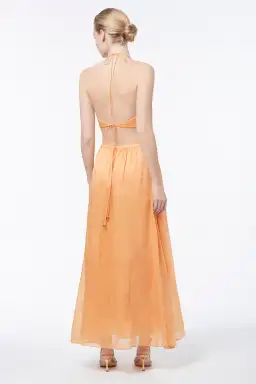 Cut from a lightweight silk linen, the Lyrical Colours Halter Maxi Dress in Mango Sorbet is designed with balmy summer nights in mind.