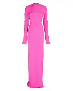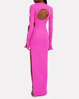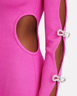 Mach & Mach Stretch Knit Cut Out Crystal Bow Sleeves Maxi Dress Pink