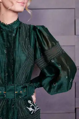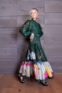 Echoing nineties essences and ski slope vibes, the Apres Ski Maxi Dress blends a deep forest green backdrop with adorning mountain portraits, bright cloud cascades, vintage skiers adorning the slopes. This luxury silk dress features a french lace trims, and flared silhouette, adjustable belt and a relaxed fit.