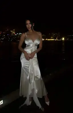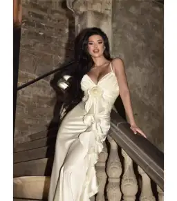 Embrace timeless elegance with the Champagne Satin Floral Evening Gown. Crafted from luxurious, high-satin, this gown features a delicate adjustable strap design that enhances the décolletage, while the fitted bodice flows gracefully into a floor-length skirt. A beautifully draped front, adorned with a floral accent, adds a touch of romance and sophistication, making it ideal for evening occasions and black-tie events. Pair with sparkling jewelry for a captivating look that exudes confidence and grace.