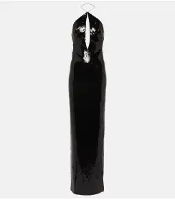 Crafted from premium black sequin fabric that shimmers with every movement, the gown features a halter neckline with a daring keyhole cutout, offering a sultry yet refined silhouette. Perfect for galas, red carpet events, or any occasion demanding a statement look, this gown embodies the essence of Maelle Paris—classy, modern, and unapologetically bold.