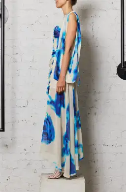The Majestic Dreamer dress features a fitted under bodice and draped overlay, cinched in with a lingerie wire detail on the centre front and the gathered silk following seam lines. The fitted waist is draped down the centre front, with splits and flowing full length skirt. The cape-like sleeve draping is fastened at the shoulder with rouelau ties. The dress has a zip at centre back.