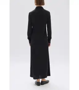 Slim line jersey knit long sleeve dress. Features front button placket detailing and finished with a simple collar design.