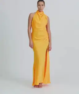 Elegance and timeless beauty infused with a modern twist. Introducing the Venus Maxi Dress – showcasing a slim fit cut, low back with draping self fabric sash and high neckline.