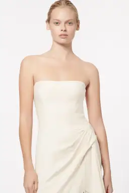 With a slim fitting bodice and flowing maxi length skirt, the Asymmetrical Games Strapless Gown is perfect for your next black tie event. Featuring an asymmetric waistline with an alluring front side slit for ease of movement. The floor length white dress is detailed with internal boning in the bodice to create a flattering and fitted look.
