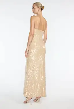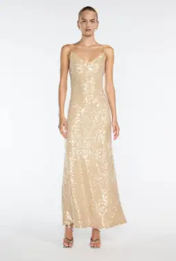 Embrace elegance with the Light Angles Slip Dress, this dress is crafted from a nude sequin fabric and features a v-neckline with adjustable straps, a graceful and alluring piece designed to enhance your femininity. A beautiful dress that catches the light with every movement.